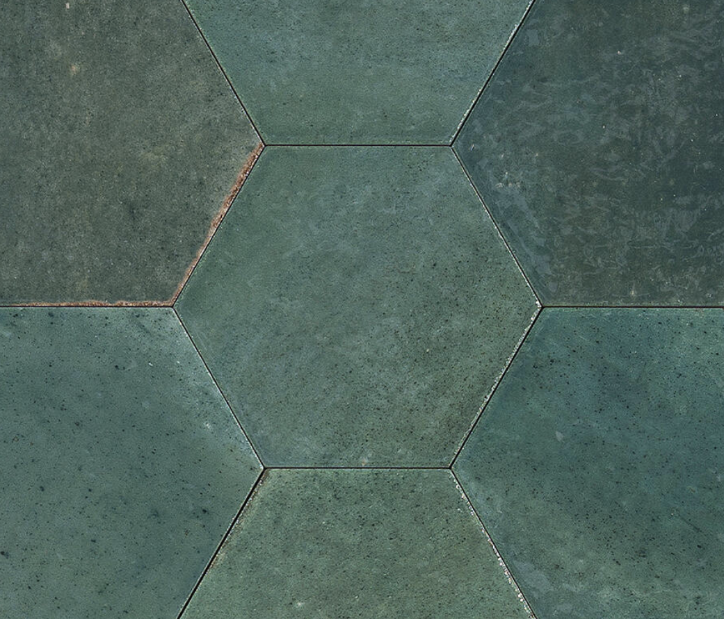 Côté design, le choix s’est porté sur un carrelage zellige vert aux formes hexagonales, subtilement rehaussé de touches dorées pour apporter élégance et caractère à l’ensemble.
