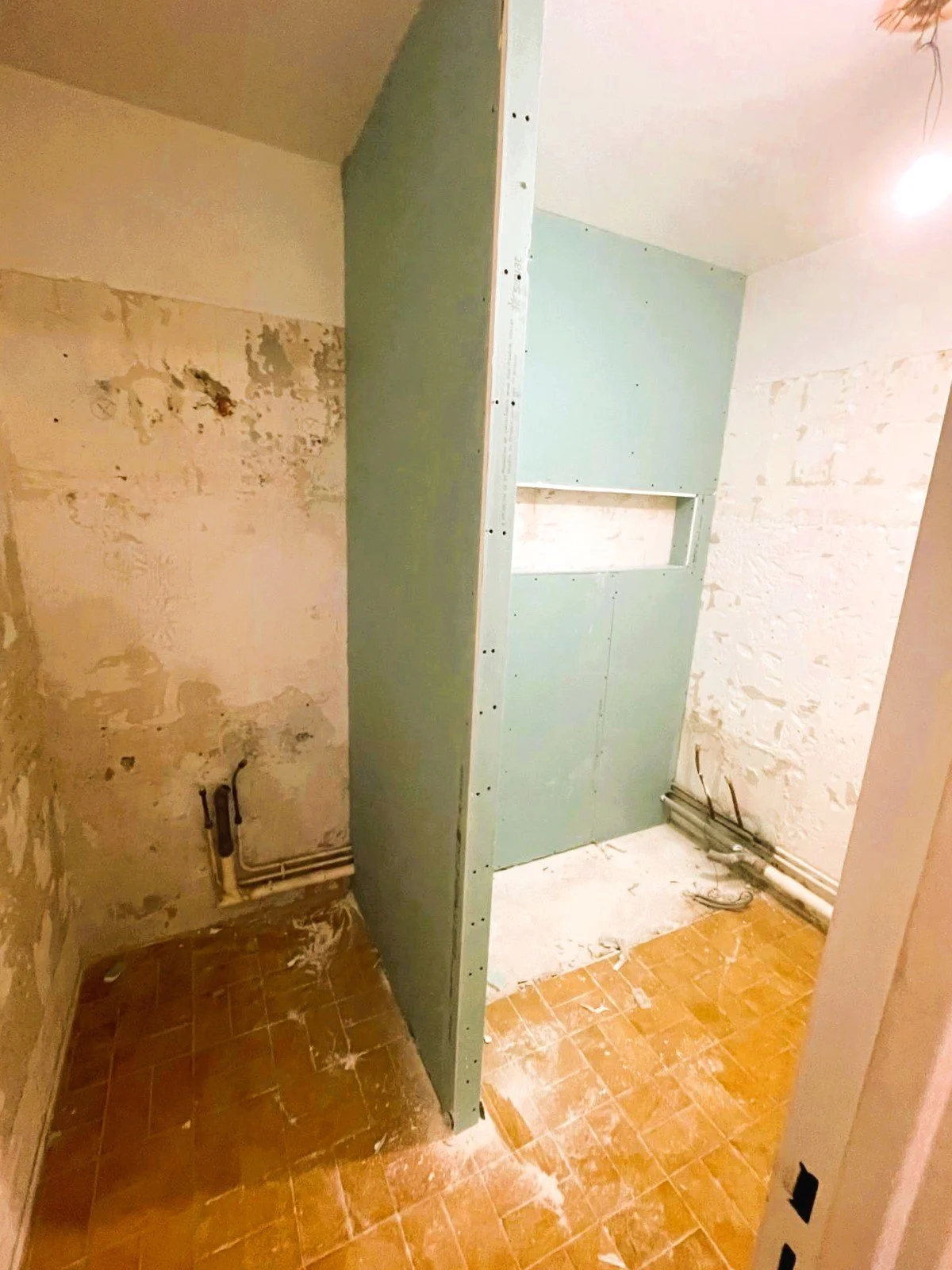 Pour ce nouveau projet, notre client a souhaité la création d’une grande douche à l’italienne, intégrant une cloison pleine et une large paroi vitrée afin d’allier confort, luminosité et modernité.
